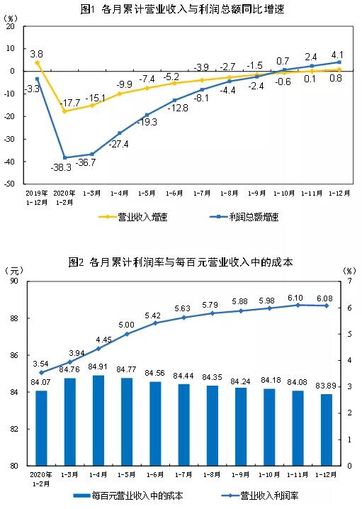 2020年,規(guī)模以上工業(yè)企業(yè)實(shí)現(xiàn)營(yíng)業(yè)收入106.14萬(wàn)億元,比上年增長(zhǎng)0.8%;發(fā)生營(yíng)業(yè)成本89.04萬(wàn)億元,增長(zhǎng)0.6%;營(yíng)業(yè)收入利潤(rùn)率為6.08%,比上年提高0.20個(gè)百分點(diǎn)。其中,造紙和紙制品業(yè)實(shí)現(xiàn)營(yíng)業(yè)收入13012.7億元,同比下降2.2%;印刷和記錄媒介復(fù)制業(yè)實(shí)現(xiàn)營(yíng)業(yè)收入6472.3億元,同比下降5.2%。 2020年末,規(guī)模以上工業(yè)企業(yè)資產(chǎn)總計(jì)126.76萬(wàn)億元,比上年末增長(zhǎng)6.7%;負(fù)債合計(jì)71.06萬(wàn)億元,增長(zhǎng)6.1%;所有者權(quán)益合計(jì)55.70萬(wàn)億元,增長(zhǎng)7.4%;資產(chǎn)負(fù)債率為56.1%,比上年末下降0.3個(gè)百分點(diǎn)。 2020年末,規(guī)模以上工業(yè)企業(yè)應(yīng)收賬款16.41萬(wàn)億元,比上年末增長(zhǎng)15.1%;產(chǎn)成品存貨4.60萬(wàn)億元,增長(zhǎng)7.5%。 2020年,規(guī)模以上工業(yè)企業(yè)每百元營(yíng)業(yè)收入中的成本為83.89元,比上年減少0.11元;每百元營(yíng)業(yè)收入中的費(fèi)用為9.17元,比上年增加0.14元。 2020年末,規(guī)模以上工業(yè)企業(yè)每百元資產(chǎn)實(shí)現(xiàn)的營(yíng)業(yè)收入為87.8元,比上年末減少5.0元;人均營(yíng)業(yè)收入為145.0萬(wàn)元,比上年末增加5.5萬(wàn)元;產(chǎn)成品存貨周轉(zhuǎn)天數(shù)為17.9天,比上年末增加1.2天;應(yīng)收賬款平均回收期為51.2天,比上年末增加5.8天。 2020年12月份,規(guī)模以上工業(yè)企業(yè)實(shí)現(xiàn)利潤(rùn)總額7071.1億元,同比增長(zhǎng)20.1%,增速比11月份加快4.6個(gè)百分點(diǎn)。 國(guó)家統(tǒng)計(jì)局工業(yè)司高級(jí)統(tǒng)計(jì)師朱虹表示,2020年,工業(yè)企業(yè)效益持續(xù)改善:企業(yè)利潤(rùn)逐季回升,單月連續(xù)7個(gè)月較快增長(zhǎng);利潤(rùn)增長(zhǎng)面超過(guò)六成,制造業(yè)拉動(dòng)作用明顯;單位成本連續(xù)下降,盈利能力有所增強(qiáng);企業(yè)虧損面逐季縮小,虧損程度不斷減輕。 分季度看,今年利潤(rùn)呈現(xiàn)“由負(fù)轉(zhuǎn)正、逐季加快”的走勢(shì)。受疫情嚴(yán)重沖擊影響,一季度利潤(rùn)同比大幅下降36.7%,隨著“六穩(wěn)”“六保”任務(wù)不斷落實(shí)落細(xì),企業(yè)復(fù)工復(fù)產(chǎn)水平穩(wěn)步提升,二季度利潤(rùn)增長(zhǎng)4.8%,增速實(shí)現(xiàn)由負(fù)轉(zhuǎn)正,三季度增速回升至15.9%,四季度進(jìn)一步加速至20.8%。12月份,規(guī)模以上工業(yè)企業(yè)利潤(rùn)同比增長(zhǎng)20.1%,增速比11月加快4.6個(gè)百分點(diǎn),繼5月份實(shí)現(xiàn)月度增速由負(fù)轉(zhuǎn)正后,連續(xù)7個(gè)月保持兩位數(shù)增長(zhǎng)。