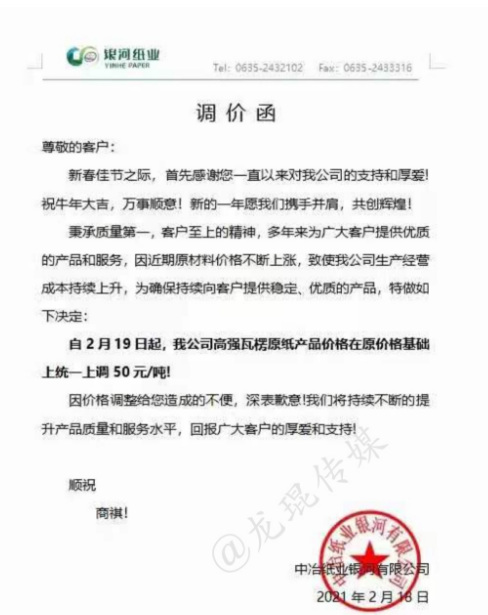 2月18日,正值業內各大企業開工之際,新的一批原紙、紙板漲價函就已襲來。2月19日,漲價范圍逐步擴大,各地中小型紙企紛紛跟漲,紙板、紙箱價格水漲船高。顯然,2021年春節后的第一輪漲價潮,已初具規模。 各地中小跟漲50-200元/噸 在國內三大包裝紙龍頭中,玖龍紙業計劃2月22日上調紙價,山鷹紙業已于2月18日宣布漲價,理文造紙則在2月19日開始調價:江西理文H紙價格上調200元/噸,B/Q紙價格上調100元/噸;江蘇理文箱板紙價格上調100元/噸。 其他大型紙廠也傳出漲價消息,如福建聯盛紙業,牛卡紙漲價100-200元/噸,瓦楞紙漲價100元/噸;浙江景興紙業,瓦楞紙、牛卡紙上調100元/噸;湖北金鳳凰紙業,瓦楞紙上漲100元/噸;山東世紀陽光紙業,白面牛卡紙漲價300元/噸,瓦楞紙上漲100元/噸…… 同時,各地的中小型紙廠也紛紛發布漲價函,東莞金田紙業、中冶銀河紙業、玉田縣順發實業、棗莊華潤紙業等紙企跟漲50-200元/噸,涉及瓦楞紙、牛卡紙、灰紙板等紙種。據筆者統計,目前這輪漲價函已涵蓋浙江、廣東、福建、湖北、河北、山東、江西、江蘇等省份。 東莞市金田紙業有限公司 從2021年2月20日起,所有灰紙板產品在原價格基礎上統一上漲200元/噸,金娃牌環保牛卡紙、金泊牌再生牛卡紙在原價格基礎上上漲100元/噸。  中冶銀河紙業有限公司 從2月19日起,高強瓦楞原紙產品價格在原價格基礎上統一上漲50元/噸。  玉田縣順發實業有限公司 從2021年2月19日起,所有克重及品項的成品紙上漲100元/噸。  棗莊華潤紙業有限公司 從2021年2月20日起,一次成型灰紙板和卷筒灰板紙在原有價格基礎上統一漲價200元/噸。  紙板漲價范圍逐步擴大 2月18日,在原紙價格持續拉升的狀態下,福建福州、浙江寧波、浙江臺州等城市的紙板廠首先打響了年后的第一輪上漲。2月19日,紙板漲價范圍逐步擴大,江西上饒、廣東揭陽、浙江金華等城市也迎來了新的紙板漲價函。 上饒市卓然實業有限公司 即日起,三層紙板上調0.05元/平方,四、五層上調0.1元/平方米,七層上漲0.15元/平方米。  磐安市宜家工貿有限公司 自2月19日17點開始,三層紙板上漲0.1元/平方,四層、五層上漲0.2元/平方,七層上漲0.3元/平方。加硬一層110克加0.2元/平方,加硬一層130克加0.3元/平方,加硬一層160克加0.6元/平方。  永康市星光包裝 從2月19日17點開始,三層紙板上調0.1元/平方,五層上漲0.2元/平方;110克加硬一層加0.2元/平方,兩層加0.4元/平方;140克加硬一層加0.3元/平方,兩層加0.6元/平方;160克加硬一層加0.55元/平方,兩層加1.1元/平方;紙板長度少于50厘米,另加0.2元/平方;紙板寬度少于20厘米,另加0.2元/平方。  成豐紙業 從2021年2月21日18點開始,價格上調。  盡管年前大家對年后的紙價形勢已有心理準備,但原紙漲價潮真正到來的這一刻,還是會有所驚訝。尤其是對處于紙品包裝產業鏈最下游的紙箱廠而言,成本不斷上漲,有時根本來不及與客戶協商調價,最終只能由自身承擔一部分風險。 此外,還有一個現象需要注意,當前除了原紙之外,各種大宗原料基本上都保持上漲勢頭,這是否意味著,紙價上漲并非是單純的行業現象,而是宏觀環境下的小小縮影?