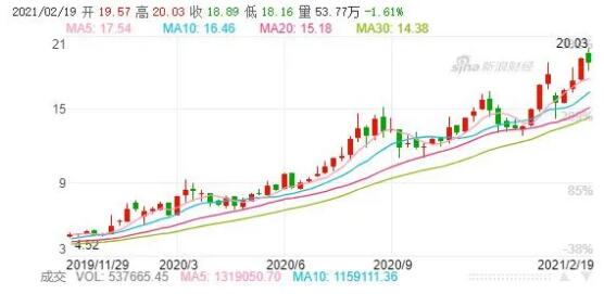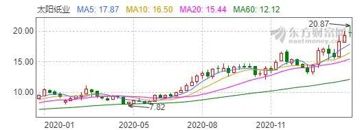 春節(jié)過后,在一片山呼海嘯般的原紙漲價潮中,紙業(yè)股陷入瘋狂,玖龍、晨鳴、太陽、博匯股價均創(chuàng)下歷史新高。2月19日,造紙股集體爆發(fā),其中,玖龍紙業(yè)漲超5%,理文造紙漲超6%,晨鳴紙業(yè)漲近8%。 晨鳴紙業(yè)股價狂漲67%+94% 繼春節(jié)前最后一個交易日與新年開工第一個交易日的兩連板后,2月19日,晨鳴紙業(yè)A股繼續(xù)大漲7.75%。 若從進入2月開始算起,晨鳴紙業(yè)A股已經(jīng)取得7天4板,10天漲超67%的成績。目前,公司股價為12.10元,市值361億元,較1月底上漲了145億。港股方面,晨鳴紙業(yè)2月股價更是上漲了94%,截至2月19日收盤,報8.84港元,漲3.76%,市值264億港元。特別是2月18日,晨鳴紙業(yè)在1天內(nèi)漲了19.50%。 玖龍紙業(yè)股價一年狂漲170%