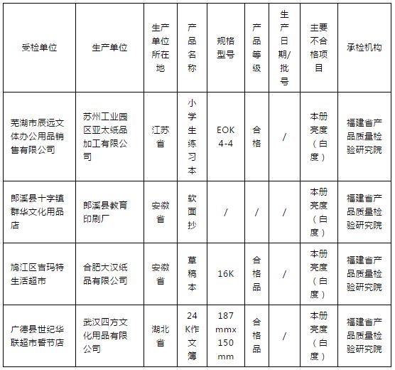 統計發現,共有四款學生用本被抽查出“本冊亮度(白度)”指標不合格。生產單位分別是蘇州工業園區亞太紙品加工有限公司、郎溪縣教育印刷廠、合肥大漢紙品有限公司和武漢四方文化用品有限公司。
