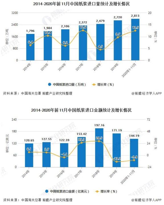 據中國海關總署統計數據顯示,2019年去年中國紙漿進口量達到了2720萬噸,累計增長9.7%。截止至2020年11月中國紙漿進口量為282萬噸,同比增長9.3%。累計方面,2020年1-11月中國紙漿進口量累計達到2813萬噸,相比上年同期增長了311萬噸,累計增長12.5%。