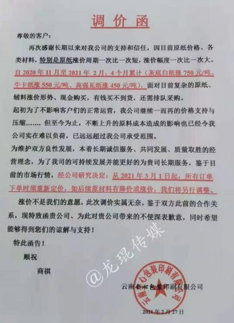 云南全心包裝印刷有限公司調(diào)價(jià)函(有刪減) 目前各類材料,特別是原紙漲價(jià)周期一次比一次短,漲價(jià)幅度一次比一次大。自2020年11月到2021年2月的4個月里,灰底白板紙累計(jì)上漲750元/噸,牛卡紙累計(jì)上漲550元/噸,高強(qiáng)瓦紙累計(jì)上漲450元/噸。面對目前復(fù)雜的原紙、輔料漲價(jià)形勢,不僅現(xiàn)金購買、有錢買不到貨,還需排隊(duì)采購。 起初為了不影響客戶的正常運(yùn)營,公司繼續(xù)一而再的價(jià)格支持與壓縮……但至今為止,不斷上升的原料成本造成的影響,已經(jīng)令我公司實(shí)在難以負(fù)荷,已遠(yuǎn)遠(yuǎn)超過我公司承受范圍。 為維護(hù)雙方良性發(fā)展,本著長期誠信服務(wù)、共同發(fā)展、質(zhì)量取勝的經(jīng)營理念,為了我司可持續(xù)發(fā)展并能更好的為貴司長期服務(wù),鑒于目前的市場行情,經(jīng)公司研究決定:從2021年3月1日起,所有訂單下單時須重新定價(jià),如后續(xù)原材料有降價(jià)或漲價(jià),我們將另行調(diào)整。 3月份就在眼前,紙價(jià)上漲卻依舊持續(xù),除了山鷹提前喊漲外,國內(nèi)最大包裝紙廠也傳出繼續(xù)調(diào)價(jià)之聲。面對嚴(yán)峻的市場形勢,包裝企業(yè)所能做的,似乎只有是與客戶協(xié)商調(diào)價(jià),轉(zhuǎn)嫁壓力。