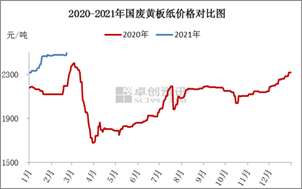 據(jù)卓創(chuàng)資訊監(jiān)測數(shù)據(jù)顯示,2月國廢黃板紙均價為2486元/噸,月環(huán)比上漲3.71%,月同比上漲15.15%。2月國廢黃板紙到廠價繼續(xù)上漲,僅春節(jié)假期期間價格穩(wěn)定,因市場交投停止。國外疫情升溫后,海運運力下降、運費上漲,促使進(jìn)口原料價格上漲,包括廢紙漿、成品紙、紙漿的進(jìn)口價格,在此背景下,加2021年之進(jìn)口廢紙數(shù)量清零,那么大型紙廠積極增加國產(chǎn)廢紙庫存儲備以應(yīng)對原料供應(yīng)缺口。這使得國內(nèi)廢黃板紙市場長期處于供小于求狀態(tài),促使其市場價格的連續(xù)上漲。