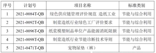 3月2日,工業(yè)和信息化部公布了《2021年第一批行業(yè)標(biāo)準(zhǔn)制修訂和外文版項(xiàng)目計(jì)劃的通知》(工信廳科函﹝2021﹞25號(hào)),批準(zhǔn)了521項(xiàng)行業(yè)標(biāo)準(zhǔn)制修訂計(jì)劃,其中包括5項(xiàng)造紙領(lǐng)域行業(yè)標(biāo)準(zhǔn)計(jì)劃項(xiàng)目。具體見下表。