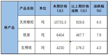 其中林產品領域,2月下旬與2月中旬相比,紙漿價格上漲467.7元,漲幅7.9%;瓦楞紙價格上漲176.2元,漲幅4.3%。