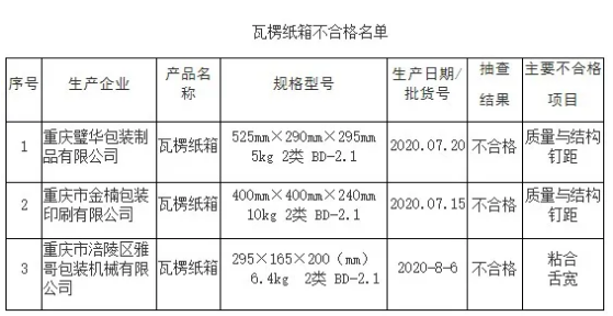 2021年3月16日,重慶市市場監督管理局網站發布2020年摩托車、建筑鋼材等5種產品質量監督抽查情況的通告。其中,抽查28個區縣的111家生產企業的125批次瓦楞紙箱產品,經檢驗,合格122批次,不合格3批次,不合格發現率為2.4%。  本次抽查涉及巴南區、北碚區、璧山區、長壽區、大渡口區、大足區、墊江縣、奉節縣、涪陵區、合川區、江北區、江津區、九龍坡區、開州區、梁平區、南岸區、南川區、綦江區、黔江區、榮昌區、沙坪壩區、石柱區、銅梁區、潼南區、萬州區、武隆區、永川區及渝北區等28個區縣的111家生產企業的125批次產品,經檢驗,合格122批次,不合格3批次,不合格發現率為2.4%,抽檢不合格項目為質量與結構釘距、粘合舌寬。