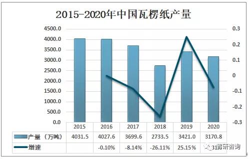 瓦楞紙作為國內產量最大的紙種之一,2016年后受國內需求放緩及廢紙進口禁令的頒布,導致中國瓦楞紙產量整體呈下降走勢。2020年中國瓦楞紙產量為3170.8萬噸,較2019年的3421.0萬噸同比下降7.31%。 一、產業鏈 瓦楞紙是由掛面紙和通過瓦楞棍加工而形成的波形的瓦楞紙粘合而成的板狀物,一般分為單瓦楞紙板和雙瓦楞紙板兩類。瓦楞紙的發明和應用已有一百多年歷史,具有成本低、質量輕、加工易、強度大、印刷適應性樣優良、儲存搬運方便等優點,80%以上的瓦楞紙均可通過回收再生,瓦楞紙可用作食品或者數碼產品的包裝,相對環保,使用較為廣泛。 瓦楞紙產業鏈: