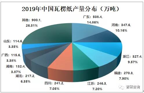 資料來源:國家統計局、智研咨詢整理 2019年中國瓦楞紙產量TOP5地區依次為廣東、河南、浙江、福建、江蘇,產量分別為508.4萬噸、347.6萬噸、327.4萬噸、270.3萬噸、246.3萬噸,占全國總產量的比重分別為14.86%、10.16%、9.57%、7.9%、7.2%。