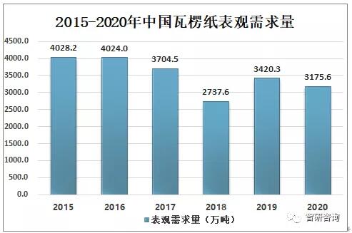 資料來源:國家統計局、智研咨詢整理 2019年中國瓦楞紙表觀需求量為3420.3萬噸,2020年中國瓦楞紙表觀需求量為3175.6萬噸,較2019年減少了244.7萬噸,同比下降7.16%。