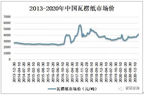 資料來源:國家統計局、智研咨詢整理 三、價格走勢 2013-2016年中國瓦楞紙市場價較為平穩,2016下半年后價格波動幅度較大,2020年回歸平穩,2021年年初價格又有所上升,截止2020年12月30日,中國瓦楞紙市場價為3756.2元/噸。