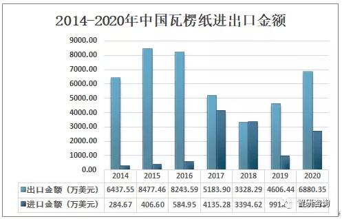 資料來源:國家統計局、智研咨詢整理 四、進出口貿易 外廢零進口執行以來,部分規模紙廠海外建廠裝置陸續投產以及國內原料供應緊缺,導致瓦楞紙進口數量大幅增加,出口數量則整體呈下降走勢;2020年中國瓦楞紙出口數量為2.49萬噸,較2019年增加了0.27萬噸;進口數量為7.28萬噸,較2019年增加了5.74萬噸。