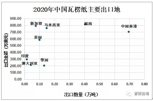 資料來源:中國海關、智研咨詢整理 2020年中國瓦楞紙出口至中國香港0.69萬噸,出口金額為705.69萬美元;出口至越南0.40萬噸,出口金額為817.16萬美元;出口至馬來西亞0.15萬噸,出口金額為763.32萬美元。