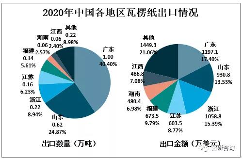資料來源:中國海關、智研咨詢整理 2020年廣東省瓦楞紙出口數量為1.0萬噸,占全國總出口數量的40.40%;出口金額為1197.1萬美元,占全國總出口金額的17.40%。2020年山東瓦楞紙出口數量為0.62萬噸,占全國總出口數量的24.87%;出口金額為930.8萬美元,占全國總出口金額的13.53%。