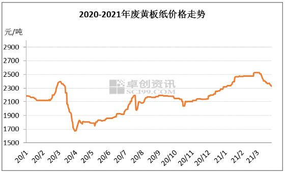 2021年1-2月份,國內(nèi)廢舊黃板紙呈單邊上漲的格局。進入3月份后,廢紙價格出現(xiàn)了一波快速回落。
