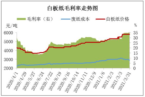 從利潤來看,如圖2所示,卓創資訊數據顯示,2021年3月份白板紙毛利率較2月增加6.43個百分點,較去年同期增加6.43個百分點。國廢黃板紙和廢舊書頁紙價格均沖高回落,3月下半月成本價格持續下跌,然白板紙價格上漲后維穩運行,因此紙廠毛利環比有所增加。 4月1日,規模紙廠領頭進行價格優惠100-200元/噸不等,其他中小紙企陸續跟進。卓創資訊數據監測,4月2日A級250g灰底白板紙含稅出廠日均價5667.5元/噸,較3月31日日均價下降2.37%。截止4月2日,250g白板紙市場主流成交含稅參考價5800-6100元/噸,成交重心緩慢下移。那么引起本次價格下滑的主要因素有哪些呢? 第一,從成本面來看,據卓創資訊監測數據顯示,3月國廢黃板紙均價為2409元/噸,月環比下跌3.10%,月同比上漲14.01%。3月國廢黃板紙市場價格沖高回落。價格回落的主要原因如下:1.國外疫情再次反彈;2.中美談話氣氛緊張;3.成品紙銷售大幅下降;4.廢紙打包站集中出貨套現;5.龍頭紙企護盤失敗后轉為領跌。 據卓創資訊監測數據顯示,3月國廢書本紙月均價為2518元/噸,月環比上漲3.75%,同比上漲22.54%;國廢報紙月均價為2906元/噸,月環比下跌2.62%,月同比上漲11.54%。3月國內廢舊書本紙價格沖高回落,廢舊報紙價格則呈高位下跌的格局。 整體來看,紙企面臨成品紙去庫存壓力,對廢紙的需求相對放緩。而在廢書本價格持續下調后,廢紙供應也有所減少,因此成本面無利好支撐。 第二,從供需面來看,節后紙廠多恢復正常生產,市場供應充足,然下游需求持續不佳,總體供應大于需求。如圖3、圖4所示,據卓創資訊監測數據顯示,2021年3月白板紙生產企業開工負荷率較2月份上升1.81%,較去年同期減少14.38個百分點。3月份產量較2月份上升13.65個百分比,較去年同期變化不大。卓創資訊根據對國內各省市代表性生產企業調研發現,3月份白板紙生產企業庫存持續窄幅增加,截至31日企業庫存量環比2月底上升10.97%左右,庫存天數在13天左右。