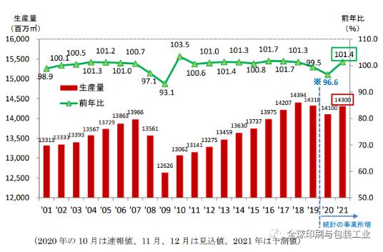 考慮到這種瓦楞紙板的需求趨勢和經(jīng)濟(jì)前景,預(yù)計(jì)2021年,日本國內(nèi)的瓦楞紙板需求量約143億平方米(比總量合計(jì)為上年的101.4%)。如果按月細(xì)分,預(yù)計(jì)1-3月為上年同期總量的99.0%,4-9月為上年同期總量的102.5%,10-12月為上年同期總量的101.5%。按需求部門劃分的趨勢如下: 預(yù)計(jì)“加工食品”(構(gòu)成比為41%)將增長約2%,其中對家常便餐的需求穩(wěn)定,并且從下半年開始逐漸用于商業(yè)用途。 預(yù)計(jì)“其他”(占總數(shù)的17%)將增長約1%,原因是老年人保健產(chǎn)品的增加,以及對家用紙張相關(guān)產(chǎn)品的穩(wěn)定需求。 盡管存在諸如種植面積減少等不利因素,“水果和蔬菜”(組成比為10%)預(yù)計(jì)將增長約1%。 預(yù)計(jì)“用于電器和機(jī)械/器具”的銷售額(構(gòu)成比為7%)將逐漸恢復(fù),主要是汽車領(lǐng)域,并有望增長約2%。 預(yù)計(jì)“化學(xué)藥品/清潔劑/化妝品”(構(gòu)成比為6%)將與上一年大致相同,因?yàn)榭梢酝ㄟ^建立新的生活方式來預(yù)期對化學(xué)藥品和清潔劑的需求,但對化妝品的內(nèi)向需求不能滿足有望恢復(fù)。 “郵購/送貨/搬家”(構(gòu)成比為5%)將增加約2%,這是因?yàn)樵陔娚淌袌龀掷m(xù)增長的同時(shí),帶動了對瓦楞紙箱需求的增長,即便是疫情結(jié)束,這種趨勢仍將繼續(xù)維持。 根據(jù)日本造紙協(xié)會發(fā)布的預(yù)測,自2011年以來,日本國內(nèi)對紙和紙板的需求一直處于下降趨勢。受到新冠疫情沖擊的2020年,更是加速了這種趨勢,同比上年下降了9.6%,這個(gè)下降速度也超過了之前2009年因雷曼兄弟破產(chǎn)而引發(fā)的金融海嘯而造成的行業(yè)下降,當(dāng)時(shí)下降了9.2%?傮w來說,主要是由于圖形紙需求的顯著減少和包裝紙需求(主要是包裝紙和白板紙)的減少所致。 談及2021年,由于數(shù)字化等結(jié)構(gòu)性因素的下行將繼續(xù)為紙和紙板行業(yè)帶來壓力,預(yù)計(jì)在2020年由于新冠疫情而急劇下降的商業(yè)印刷會進(jìn)一步加劇下滑,但也存在很大的不確定性。 另一方面,還有強(qiáng)大的需求領(lǐng)域,如在線購物。此外,由于居民在衛(wèi)生意識方面的的提高,而且新冠疫情也導(dǎo)致了對生活用紙,尤其是紙巾需求的增加。當(dāng)然,全球在禁塑令方面的推進(jìn),也有望增加紙張需求。 按產(chǎn)品總體統(tǒng)計(jì),預(yù)計(jì)紙和紙板總量為2302萬噸,比上年增長0.4%。具體到各領(lǐng)域,預(yù)計(jì)圖形紙將減少0.8%,包裝紙將增加1.1%,衛(wèi)生紙將增加1.0%。盡管預(yù)計(jì)紙和紙板的總量將在11年內(nèi)首次增加,但與上一年的下降相比,增長率很小。此外,它將超過2000年峰值(3197萬噸)的70%。按照季度計(jì)算,預(yù)計(jì)1-3月為負(fù)數(shù),但預(yù)計(jì)上年較低的4-6月和7-9月,增長率將為正,而10-12月預(yù)計(jì)與上年基本持平。