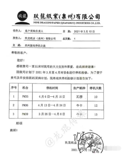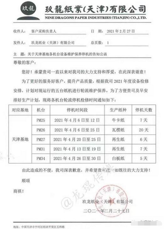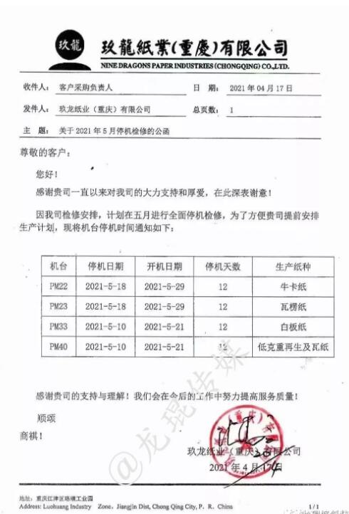 需求乏力,強勢如玖龍紙業,也不得不向市場屈服。近日,玖龍紙業又一個基地公布停機通知——重慶玖龍4臺紙機將在五月份全部停機12天。與此同時,玖龍紙業旗下多個基地原紙降價,降幅為100-400元/噸。 各類原紙價格下滑 4月20日,多個渠道傳出,天津玖龍紙業開始下調原紙價格。具體而言,再生紙、瓦楞紙、?埾抡{150元/噸,白面牛卡紙、涂布?埾抡{100元/噸,地龍灰底白下調300元/噸,江龍灰底白下調400元/噸。 100-400元/噸的降幅,似乎是今年在包裝紙行業首次見到。這也在一定程度上證明,面對下游需求乏力的現狀,作為龍頭紙廠的玖龍紙業也不得不向市場屈服。據了解,除天津基地外,玖龍紙業太倉、東莞、泉州、重慶、沈陽等基地亦在近期實施了降價或優惠的舉措。 目前市場仍處于淡季,下游包裝企業基本上以剛需采購為主,國內各大地區、各大紙廠的瓦楞紙、箱板紙等包裝紙出貨節奏放緩,價格出現不同程度的下滑。預計二季度,紙價將整體處于穩中有跌的走勢,二季度末或出現小幅反彈跡象,三季度或將重新升溫上調。 多個基地停機檢修 對于紙廠而言,應對市場景氣度不高的舉措主要有二,一是通過降價以抬高出貨量,二是通過停機檢修來減少供應量。以玖龍紙業為例,據筆者了解,除了原紙降價外,其多個基地的多臺紙機正處于停機檢修狀態或即將開始停機檢修。 4月17日,玖龍紙業重慶基地發布停機公函稱,因公司檢修安排,計劃在五月份全面停機檢修。該紙廠目前共有4條造紙生產線,主要生產牛卡紙、瓦楞紙和涂布灰底白板紙,年產能近200萬噸。其中: PM22機臺:生產白卡紙,5月18日到5月29日停機12天; PM23機臺:生產瓦楞紙,5月18日到5月29日停機12天; PM33機臺:生產白板紙,5月10日到5月21日停機12天; PM40機臺:生產低克重再生及瓦紙,5月10日到5月21日停機12天。  同時,玖龍紙業天津基地部分機臺正處于停機檢修狀態。根據停機公函,其PM34于4月26日至30日停機5天,PM25于4月6日至12日停機7天,PM26與4月6日至25日停機20天,PM27于4月20日至25日停機6天,PM31于4月13日至19日停機7天。  而玖龍紙業泉州基地部分機臺已在近期完成了停機檢修計劃。據悉,其PM35已于4月6日至4月15日停機10天,PM36已于4月13日至4月24日停機12天,PM39已于3月25日至4月6日停機13天。  可以說,整個三四月份以及即將到來的五月份,玖龍紙業都將面臨較大的市場壓力。這是紙品包裝產業鏈的淡旺季周期決定的,即便是產業鏈話語權極大的玖龍紙業,也難以改變。