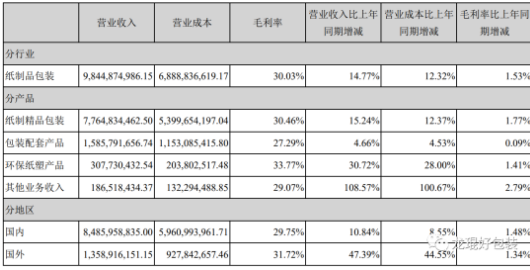 2020年?duì)I收近120億 2020年,裕同科技再度展現(xiàn)出強(qiáng)大的經(jīng)營(yíng)能力,實(shí)現(xiàn)營(yíng)收117.89億元,同比增長(zhǎng)19.75%;歸母凈利潤(rùn)為11.20億元,同比增長(zhǎng)7.20%。其主要產(chǎn)品--紙質(zhì)精品包裝、包裝配套產(chǎn)品、環(huán)保紙塑產(chǎn)品及其他業(yè)務(wù)的經(jīng)營(yíng)數(shù)據(jù)均得到穩(wěn)步增長(zhǎng)。 具體而言,紙質(zhì)精品包裝是裕同科技最主要的產(chǎn)品,其91.09億元的營(yíng)收占據(jù)了總營(yíng)收的77.26%;包裝配套產(chǎn)品營(yíng)收突破20億元,同比增長(zhǎng)26.38%;環(huán)保紙塑產(chǎn)品營(yíng)收4.26億元,雖然在總營(yíng)收的占比不到4%,但卻比2019年同比增加了38.61%。其他業(yè)務(wù)亦實(shí)現(xiàn)營(yíng)收2.49億元,同比增長(zhǎng)33.71%。 整體來(lái)看,裕同科技毛利率為26.83%,同比下降3.20%。其中,毛利率最高的產(chǎn)品為環(huán)保紙塑產(chǎn)品,高達(dá)31.61%;其次為其他業(yè)務(wù),毛利率近31%;紙制精品包裝毛利率亦超過(guò)了26.83%的整體毛利率,達(dá)27.19%;毛利率最低的是包裝配套產(chǎn)品,為23.68%,但依然維持在20%以上。  在往年的財(cái)報(bào)中,裕同科技將產(chǎn)品分為精品盒、說(shuō)明書(shū)、紙箱、不干膠及其他,而今年卻作出調(diào)整,主要是因?yàn)楣緲I(yè)務(wù)不斷擴(kuò)展,原有的分類方式已不能很好的反映公司最新業(yè)務(wù)狀況。同時(shí),為了進(jìn)一步提升公司透明度,讓投資者更充分了解公司,裕同科技還對(duì)進(jìn)出口業(yè)務(wù)的統(tǒng)計(jì)口徑進(jìn)行了變更。 因此,裕同科技在財(cái)報(bào)中還給出了另一組經(jīng)營(yíng)數(shù)據(jù)。其中,紙質(zhì)精品包裝營(yíng)收77.65億元,同比增長(zhǎng)15.24%;毛利率30.46%,同比增長(zhǎng)1.77%;包裝配套產(chǎn)品營(yíng)收15.86億元,同比增長(zhǎng)4.66%;毛利率27.29%,同比增長(zhǎng)0.09%;環(huán)保紙塑產(chǎn)品營(yíng)收3.08億元,同比增長(zhǎng)30.72%;毛利率33.77%,同比增長(zhǎng)1.41%。