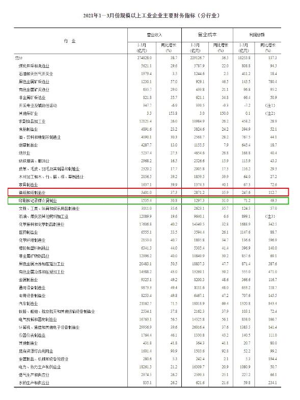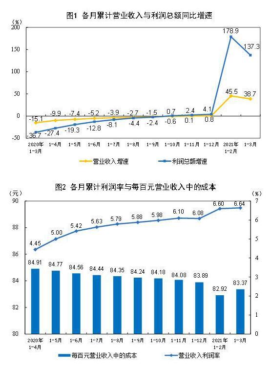 1—3月份,規(guī)模以上工業(yè)企業(yè)中,國有控股企業(yè)實(shí)現(xiàn)利潤總額6165.4億元,同比增長1.99倍;股份制企業(yè)實(shí)現(xiàn)利潤總額12792.7億元,增長1.29倍;外商及港澳臺商投資企業(yè)實(shí)現(xiàn)利潤總額5128.1億元,增長1.61倍;私營企業(yè)實(shí)現(xiàn)利潤總額5163.3億元,增長91.9%。 1—3月份,采礦業(yè)實(shí)現(xiàn)利潤總額1519.5億元,同比增長77.1%;制造業(yè)實(shí)現(xiàn)利潤總額15366.3億元,增長1.58倍;電力、熱力、燃?xì)饧八a(chǎn)和供應(yīng)業(yè)實(shí)現(xiàn)利潤總額1368.0億元,增長56.9%。  1—3月份,在41個(gè)工業(yè)大類行業(yè)中,39個(gè)行業(yè)利潤總額同比增加,1個(gè)行業(yè)扭虧為盈,1個(gè)行業(yè)實(shí)現(xiàn)減虧。主要行業(yè)利潤情況如下:汽車制造業(yè)利潤總額同比增長8.43倍,有色金屬冶煉和壓延加工業(yè)增長4.71倍,黑色金屬冶煉和壓延加工業(yè)增長3.88倍,化學(xué)原料和化學(xué)制品制造業(yè)增長3.43倍,電氣機(jī)械和器材制造業(yè)增長1.67倍,專用設(shè)備制造業(yè)增長1.46倍,計(jì)算機(jī)、通信和其他電子設(shè)備制造業(yè)增長1.41倍,通用設(shè)備制造業(yè)增長1.19倍,煤炭開采和洗選業(yè)增長94.3%,非金屬礦物制品業(yè)增長69.1%,電力、熱力生產(chǎn)和供應(yīng)業(yè)增長50.7%,紡織業(yè)增長40.4%,農(nóng)副食品加工業(yè)增長28.9%,石油和天然氣開采業(yè)增長18.4%。 值得關(guān)注的是,造紙和紙制品業(yè)實(shí)現(xiàn)利潤總額247.6億元,同比增長112.7%;印刷和記錄媒介復(fù)制業(yè)實(shí)現(xiàn)利潤總額71.2億元,同比增長49.3%。 1—3月份,規(guī)模以上工業(yè)企業(yè)實(shí)現(xiàn)營業(yè)收入27.48萬億元,同比增長38.7%;發(fā)生營業(yè)成本22.91萬億元,增長36.5%;營業(yè)收入利潤率為6.64%,同比提高2.76個(gè)百分點(diǎn)。其中,造紙和紙制品業(yè)實(shí)現(xiàn)營業(yè)收入3401.0億元,同比增長37.3%;印刷和記錄媒介復(fù)制業(yè)實(shí)現(xiàn)營業(yè)收入1535.4億元,同比增長30.8%。  3月末,規(guī)模以上工業(yè)企業(yè)資產(chǎn)總計(jì)128.70萬億元,同比增長9.5%;負(fù)債合計(jì)72.47萬億元,增長9.0%;所有者權(quán)益合計(jì)56.23萬億元,增長10.1%;資產(chǎn)負(fù)債率為56.3%,同比下降0.3個(gè)百分點(diǎn)。 3月末,規(guī)模以上工業(yè)企業(yè)應(yīng)收賬款16.59萬億元,同比增長17.1%;產(chǎn)成品存貨4.73萬億元,增長8.5%。 1—3月份,規(guī)模以上工業(yè)企業(yè)每百元營業(yè)收入中的成本為83.37元,同比減少1.36元;每百元營業(yè)收入中的費(fèi)用為8.60元,同比減少1.04元。 3月末,規(guī)模以上工業(yè)企業(yè)每百元資產(chǎn)實(shí)現(xiàn)的營業(yè)收入為86.0元,同比增加18.1元;人均營業(yè)收入為152.7萬元,同比增加40.8萬元;產(chǎn)成品存貨周轉(zhuǎn)天數(shù)為18.3天,同比減少4.7天;應(yīng)收賬款平均回收期為53.8天,同比減少10.2天。 3月份,規(guī)模以上工業(yè)企業(yè)實(shí)現(xiàn)利潤總額7111.8億元,同比增長92.3%。 國家統(tǒng)計(jì)局工業(yè)司高級統(tǒng)計(jì)師朱虹解讀工業(yè)企業(yè)利潤數(shù)據(jù)表示,一季度,宏觀政策科學(xué)精準(zhǔn)實(shí)施,統(tǒng)籌疫情防控和經(jīng)濟(jì)社會發(fā)展成果進(jìn)一步鞏固和拓展,工業(yè)經(jīng)濟(jì)持續(xù)恢復(fù),企業(yè)生產(chǎn)經(jīng)營穩(wěn)中向好,利潤延續(xù)較快恢復(fù)態(tài)勢,運(yùn)營效率不斷提升,實(shí)現(xiàn)良好開局。各行業(yè)利潤普遍增長,近四成行業(yè)利潤翻番。原材料制造業(yè)拉動工業(yè)利潤增長作用明顯。裝備制造業(yè)、高技術(shù)制造業(yè)保持良好增勢。 總體來看,一季度工業(yè)企業(yè)效益狀況延續(xù)較快恢復(fù)態(tài)勢,但也要看到,全球疫情走勢和國際環(huán)境還存在較大不確定性,行業(yè)間恢復(fù)仍不均衡,特別是原材料價(jià)格明顯上漲不斷加大企業(yè)成本壓力,工業(yè)企業(yè)效益恢復(fù)基礎(chǔ)仍需進(jìn)一步鞏固。下階段,要繼續(xù)保持宏觀政策的連續(xù)性穩(wěn)定性,著力補(bǔ)短板、挖潛力、增優(yōu)勢,擴(kuò)大有效需求,提升發(fā)展質(zhì)效,不斷鞏固實(shí)體經(jīng)濟(jì)恢復(fù)基礎(chǔ),推動工業(yè)經(jīng)濟(jì)持續(xù)穩(wěn)定健康發(fā)展。