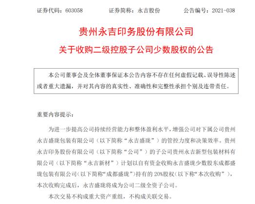 貴州永吉印務股份有限公司(永吉股份,SH603058)5月5日發布公告稱,為進一步提高公司持續經營能力和整體盈利水平,增強公司對下屬公司貴州永吉盛瓏包裝有限公司的管控力度和決策效率。貴州永吉印務股份有限公司的子公司貴州永吉新型包裝材料有限公司計劃以自有資金收購永吉盛瓏少數股東成都盛瓏包裝有限公司持有的20%股權,本次收購完成后,永吉盛瓏將成為公司二級全資子公司。  交易概述 為進一步提高公司持續經營能力和整體盈利水平,增強公司對下屬公司永吉 盛瓏的管控力度和決策效率,永吉新材計劃使用自有資金收購永吉盛瓏少數股東成都盛瓏持有的20%股權本次交易價格由各方依據永吉新材聘請的評估機構對目標公司出具的估值結果協商確定;成都盛瓏應獲得的交易總對價原則上為目標公司估值與其在截至本次交易的正式協議簽署時的持股比例的乘積。本次收購完成后,永吉盛瓏將成為公司二級全資子公司。 截至目前,公司已與交易對方簽署了股權轉讓框架協議,本次交易尚需簽署正式股權轉讓協議。 交易對方及交易標的基本情況 交易對方基本情況: 統一社會信用代碼:915101846936728025 名稱:成都盛瓏包裝有限公司 類型:有限責任公司(自然人投資或控股) 法定代表人:梅桂陽 注冊資本:300萬人民幣 住所:成都崇州經濟開發區華業路 營業期限:無固定期限 經營范圍:生產銷售包裝制品;以及其他無需許可或審批的合法項目 股東情況:梅桂陽持股50%,林勇坤持股50%。 交易標的基本情況: (一)本次交易標的系成都盛瓏持有的永吉盛瓏全部20%股權。該股權不存 在抵押、質押或者其他第三人權利,不涉及重大爭議、訴訟或仲裁事項,也不存在查封、凍結等司法措施等情形。 (二)標的公司的基本情況 統一社會信用代碼:91522730MA6HJ3NF4N 名稱:貴州永吉盛瓏包裝材料有限公司 類型:有限責任公司 法定代表人:黃革 實收資本:2250萬元人民幣 住所:貴州省黔南州龍里縣冠山街道高新技術產業園 營業期限:2019-01-23至無固定期限 經營范圍:法律、法規、國務院決定規定禁止的不得經營;法律、法規、國務院決定規定應當許可(審批)的,經審批機關批準后憑許可文件經營。法律、法規、國務院決定無需許可的,市場主體自主選擇經營。(酒盒,手工盒、食品包裝及其他紙制品包裝的加工銷售。)股東情況:子公司永吉新材持股80%,成都盛瓏持股20%。 股權轉讓框架協議 本次收購的交易協議簽署截至目前,永吉股份已與交易對方及對方實際控制人簽署了附條件生效的《貴州永吉盛瓏包裝有限公司股權轉讓框架協議》。該協議主要內容如下: 甲方:貴州永吉新型包裝材料有限公司 乙方:成都盛瓏包裝有限公司 丙方:梅桂陽(成都盛瓏實際控制人、永吉盛瓏總經理) (一)股權購買 甲方擬現金收購乙方持有的目標公司20%股權,乙方同意將其持有的標的股權轉讓給甲方。 (二)購買價款本次交易價格依據甲方聘請的評估機構對目標公司出具的估值結果協商確定;乙方應獲得的交易總對價原則上為目標公司估值與其在截至本次交易的正式協議簽署時的持股比例的乘積。 (三)支付方式甲方擬通過支付現金的方式支付本次交易的對價。 (四)排他性 自本框架協議生效之日起2個月內或各方書面終止本框架協議之日止,乙方、丙方未經甲方書面許可均不得直接或間接與甲方以外的任何第三方進行可能妨 礙本框架協議履行或本次交易完成的任何磋商或談判,不得與甲方以外的任何第三方簽署任何可能妨礙本次交易完成的協議或作出其他任何可能妨礙本次交易完成的安排。 (五)業績與承諾 1、乙方及丙方承諾,乙方對標的公司的出資應在正式的股權轉讓協議簽訂 前全部實繳到位,且在標的股權轉讓完成后,目標公司現有的所有業務于2021年、2022年、2023年(以下簡稱“業績承諾期”)實現的銷售收入分別為:15000萬元、25000萬元、50000萬元。丙方同意在正式的股權轉讓協議簽訂后的30天內出資人民幣450萬元通過二級市場購買貴州永吉印務股份有限公司的流通股,該流通股根據目標公司的業績完成情況逐年解鎖,解鎖的比例為第一年40%、第二年30%、第三年30%。 2、如目標公司在業績承諾期內任何一年度未能實現當年承諾的銷售收入,丙方應在目標公司該年度經審計的財務數據出具后30日內,以其初始購買的永吉股份流通股的價款為限,在其該年度鎖定的股票范圍內,按照其當年未完成業績承諾的比例,等比例將差額部分補償予目標公司,同比例對目標公司進行現金補充,丙方未進行現金補償的,該解鎖部分不得解鎖,直至該差額部分完成現金補償補足為止!静铑~計算公式如下:450*當年解鎖比例*(當年承諾銷售收入-當年已完成銷售額)/當年承諾銷售收入】 3、勤勉盡責和競業禁止義務:(1)標的股權轉讓完成后(即股權完成變更登記后)三年內,丙方應繼續留任目標公司,并應勤勉盡責的完整目標公司的各項工作;(2)在丙方任職期間,未經甲方同意,不得以任何方式從事與目標公司具有競爭關系的行業的相關業務;(3)不論丙方因何種原因從目標公司離職,丙方離職后三年內不得以任何方式從事與目標公司具有競爭關系的行業的相關業務:(4)在丙方任職期間以及離職后三年內,乙方不得與目標公司正在合作的或潛在具有合作關系的客戶接觸或以任何方式與該等客戶產生合作、聯營等業務關系。 4、各方應在各自能力