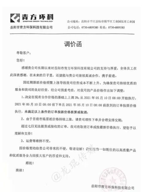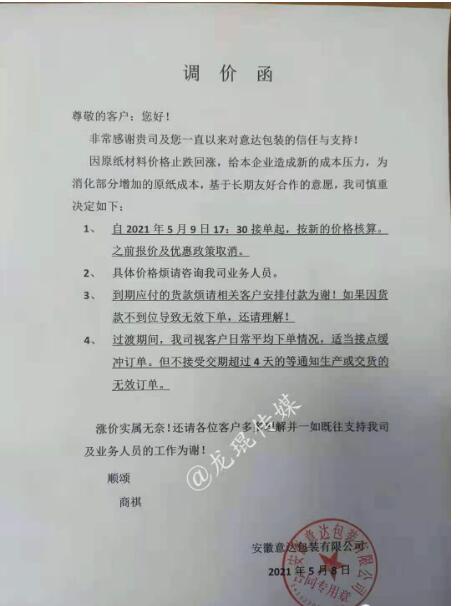 根據(jù)最新消息,5月10日,玖龍紙業(yè)東莞、太倉、天津等基地的部分高瓦、箱板紙價(jià)格將上漲50元/噸。至此,玖龍紙業(yè)5月份的原紙價(jià)格已歷經(jīng)三次變動(dòng),從啟動(dòng)優(yōu)惠調(diào)價(jià)措施到取消優(yōu)惠,再到部分基地調(diào)漲50元/噸,僅用了短短十天時(shí)間。 二季度并非紙品包裝產(chǎn)業(yè)鏈的旺季,但因4月份相關(guān)紙企降價(jià)出貨,包裝紙價(jià)持續(xù)下滑,加之國廢價(jià)格開始上調(diào),導(dǎo)致5月份紙業(yè)市場止跌回漲。此前,華東、華南、華北地區(qū)均有紙廠宣布漲價(jià),漲幅普遍為50-100元/噸。 由于原紙采購成本增加,下游紙板廠紛紛轉(zhuǎn)嫁價(jià)格壓力。5月3日-5月7日,局部地區(qū)紙板價(jià)格上漲,漲幅為2%-5%;5月8日-5月10日,因玖龍漲價(jià)消息提前發(fā)出,湖南、湖北、江蘇、安徽等地區(qū)又有多家紙板廠漲價(jià)3%。 部分最新紙板漲價(jià)函 無錫市勝源紙品有限公司 從2021年5月10日17點(diǎn)30起,所有紙板在現(xiàn)有價(jià)格基礎(chǔ)上上漲3%。  江陰市鳴朋環(huán)?萍加邢薰 從2021年5月10日17點(diǎn)停止接單。  江蘇一馬先包裝有限公司 從5月10日接單起,三層上漲0.05元/平方,四層、五層上漲0.10元/平方,七層上漲0.15元/平方。  邵陽市金美印刷包裝有限公司 從2021年5月10日17點(diǎn)半開始,所接訂單在現(xiàn)有價(jià)格基礎(chǔ)上上漲3%。  岳陽市青方環(huán)保科技有限公司 從2021年5月10日8點(diǎn)開始,決定在現(xiàn)有合作價(jià)格的基礎(chǔ)上上漲3%。  湖南永順環(huán)保材料有限公司 從2021年5月10日18點(diǎn)接單起,所有紙板價(jià)格在原有折扣基礎(chǔ)上上漲3%。  安徽意達(dá)包裝有限公司 從2021年5月9日17點(diǎn)半接單起,按新的價(jià)格核算,之前報(bào)價(jià)及優(yōu)惠政策取消。