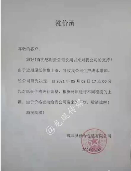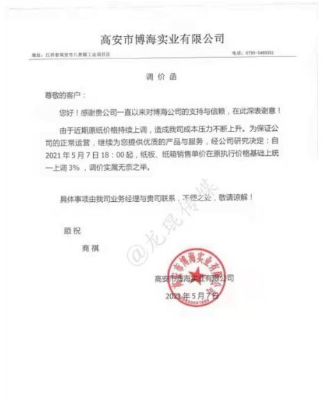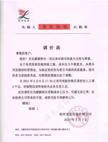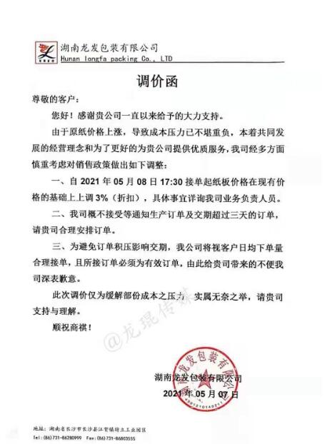 湖南龍發(fā)包裝有限公司 從2021年5月8日17點(diǎn)半接單起,紙板價(jià)格在現(xiàn)有價(jià)格基礎(chǔ)上上漲3%(折扣)。  成武縣佳合包裝有限公司 從2021年5月8日17點(diǎn)起,對(duì)紙板價(jià)格進(jìn)行調(diào)整,根據(jù)材質(zhì)進(jìn)行不同程度的上調(diào)。  宿州龍發(fā)包裝有限公司 從2021年5月8日17點(diǎn)30起,紙板價(jià)格在原折扣基礎(chǔ)上上漲3個(gè)點(diǎn)。  高安市博海實(shí)業(yè)有限公司 從2021年5月7日18點(diǎn)開始,紙板、紙箱銷售單價(jià)在原執(zhí)行價(jià)格基礎(chǔ)上統(tǒng)一上漲3%。