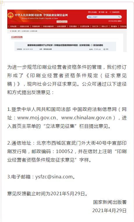 4月29日,中華人民共和國司法部、中國政府法制信息官網發布了《印刷業經營者資格條件規定(征求意見稿)》,并對該意見稿向社會公開征求意見。  輕審批,重監管 眾所周知,印刷業經營者資格條件規定是印刷經營者申請印刷經營許可證的法規依據,對印刷包裝企業的經營有著巨大影響。與以往規定相比,新規(征求意見稿)主要體現了“輕審批,重監管”的思路。 1、進一步放寬審批條件 除了前幾年在“放管服”改革中已廢除的包裝裝潢印刷品需要2臺十年之內生產且未列入淘汰目錄名單的印刷設備(對臺數、年限不做要求)條件外,本次新規(征求意見稿)再次放寬對申請從事出版物印刷的條件: 要求的設備從2臺降至1臺; 從僅限自動對開膠印印刷設備放寬至自動對開膠印、柔印印刷設備,或1臺生產型數字印刷設備。 2、進一步加強監管措施 新規(征求意見稿)對申請從事出版物印刷、包裝裝潢印刷,提出要有健全的承印驗證、登記、保管、交付、銷毀等經營管理、財務管理制度和質量保證體系(對申請從事其他印刷品和排版、制版、裝訂等專項許可,老版已經就有要求)。同時,新規(征求意見稿)要求: 印刷經營者生產的印刷產品批質量應當達到國家或者行業標準; 通過年度報告公示平臺報送年度報告。 新規(征求意見稿)還提出,對違反上述兩項要求及未取得《印刷法規培訓合格證書》的,由縣級以上地方人民政府出版管理部門責令改正,根據情節輕重,給予警告,處3萬元以下罰款。 新規(征求意見稿)全文 第一條為規范印刷業經營者從事印刷經營活動,建立公平競爭的市場環境,提升印刷供給質量和水平,推動印刷業高質量發展,根據《印刷業管理條例》和有關法律法規,制定本規定。 第二條本規定所稱印刷業經營者,包括從事出版物、包裝裝潢印刷品,以及專項排版、制版、裝訂印刷經營活動的單位,從事其他印刷品印刷經營活動的單位或者個人。 第三條申請從事出版物印刷經營活動,應當具備下列條件: (一)已完成工商注冊登記,具有法人資格,且經營范圍包括從事印刷經營活動; (二)有適應業務需要的固定生產經營場所; (三)有能夠維持正常生產經營的資金; (四)有必要的出版物印刷設備,具備1臺以上最近10年(截至提交申請的日期)生產的且未列入《產業結構調整指導目錄限制類和淘汰類》的自動對開膠印、柔印印刷設備,或1臺生產型數字印刷設備; (五)有適應業務需要的組織機構和人員; (六)有健全的承印驗證、登記、保管、交付、銷毀等經營管理、財務管理制度和質量保證體系。 第四條外商投資企業申請從事出版物印刷經營活動,除應具備本規定第三條所列條件外,還應符合外商投資準入負面清單規定的限制性準入特別管理措施。在自由貿易試驗區,外商獨資企業可申請從事出版物印刷經營活動。對港澳投資者、臺灣地區投資者或其他特殊經濟區域印刷業投資實施優惠開放措施的,按照相關規定執行。 第五條申請從事包裝裝潢印刷品印刷經營活動,應當具備下列條件: (一)已完成工商注冊登記,具有法人資格,且經營范圍包括從事印刷經營活動; (二)有適應業務需要的固定生產經營場所; (三)有能夠維持正常生產經營的資金; (四)有必要的包裝裝潢印刷設備; (五)有適應業務需要的組織機構和人員; (六)有健全的承印驗證、登記、保管、交付、銷毀等經營管理、財務管理制度和質量保證體系。 第六條申請從事其他印刷品印刷經營活動,應當具備下列條件: (一)已完成工商注冊登記,且經營范圍包括從事印刷經營活動; (二)有適應業務需要的固定生產經營場所; (三)有能夠維持正常生產經營的資金; (四)有適應業務需要的生產設備; (五)有適應業務需要的組織機構和人員; (六)有健全的承印驗證、登記、保管、交付、銷毀等經營管理、財務管理制度和質量保證體系。 第七條申請從事專項排版、制版、裝訂經營活動,應當具備下列條件: (一)已完成工商注冊登記,具有法人資格,且經營范圍包括從事印刷經營活動; (二)有適應業務需要的固定生產經營場所; (三)有能夠維持正常生產經營的資金; (四)有必要的排版、制版、裝訂設備,具備1臺以上最近10年(截至提交申請的日期)生產的且未列入《產業結構調整指導目錄限制類和淘汰類》的印前或印后加工設備; (五)有適應業務需要的組織機構和人員; (六)有健全的承印驗證、登記、保管、交付、銷毀等經營管理、財務管理制度和質量保證體系。 第八條印刷業經營者從事多種類型印刷經營活動的,應當同時具備相應類別的資格條件。 第九條出版管理部門應當自收到申請之日起20個工作日內作出批準或者不批準的決定。批準申請的,應當發給印刷經營許可證,并在經營范圍中注明印刷企業所從事的印刷經營活動的種類。其中,以生產型數字印刷機申請從事印刷經營活動的,應在經營范圍中注明“以數字印刷方式從事出版物、包裝裝潢印刷品和其他印刷品的印刷”。不批準申請的,應當通知申請人并說明理由。 第十條出版管理部門必須按照本規定審批從事印刷經營活動申請,不符合本規定條件的不得批準。其中,申請從事出版物印刷經營活動,或以生產型數字印刷機申請從事印刷經營活動,應由省級人民政府出版管理部門審批。申請從事包裝裝潢印刷品印刷經營活動、從事其他印刷品印刷經營活動及從事專項排版、制版、