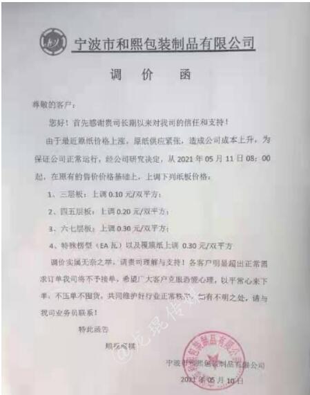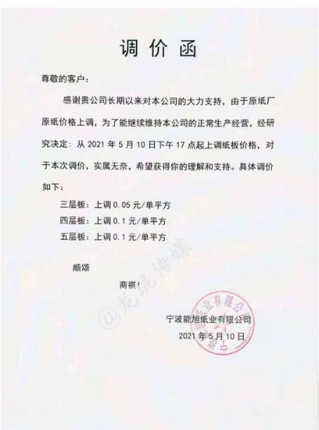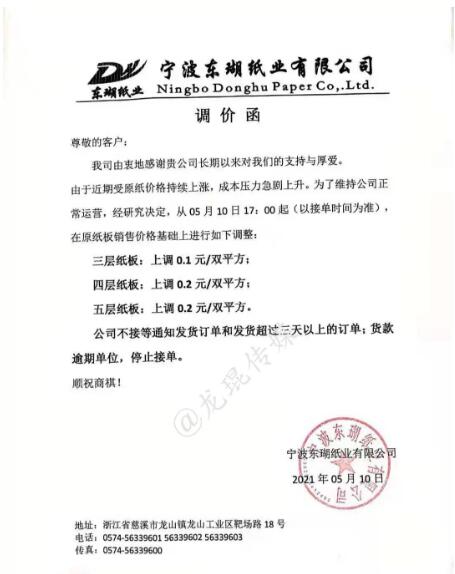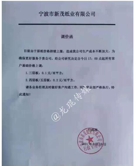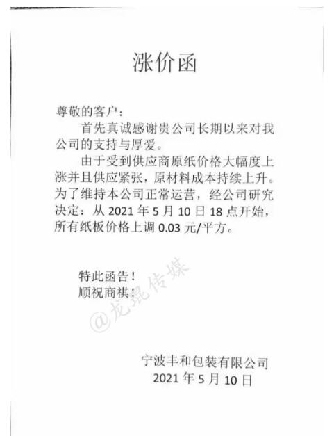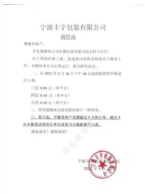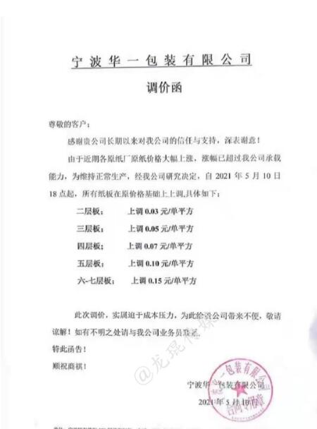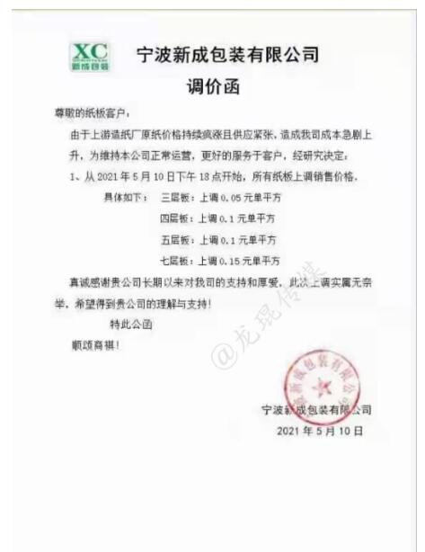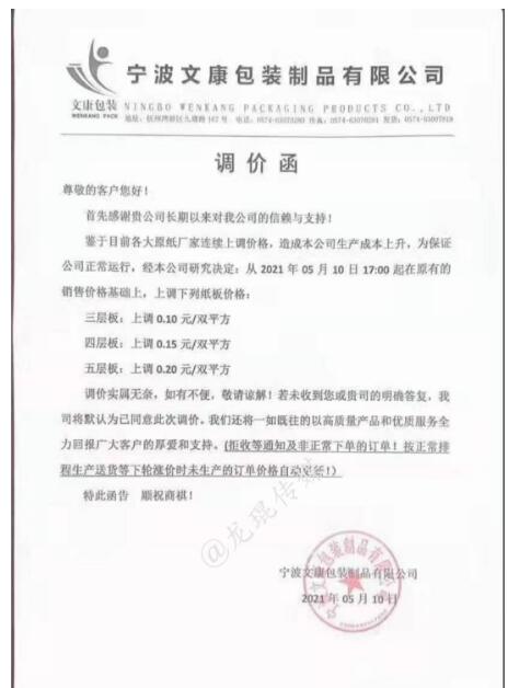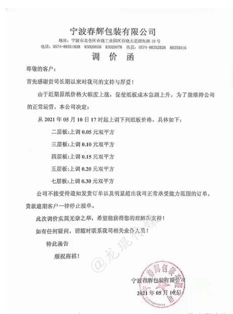 5月10日,龍頭紙廠最新漲價(jià)計(jì)劃正式生效,浙江、廣東、福建、山東、河北等地大批紙廠同步上漲,瓦楞紙及箱板紙漲幅為50-100元/噸。同一時(shí)間,下游紙板市場漲價(jià)范圍逐步擴(kuò)大,由湖南、華北、江蘇、安徽等地蔓延至浙江省。 浙江是紙制包裝大省,紙板、紙箱產(chǎn)量位居全國前列。作為浙江重要的工商業(yè)城市、經(jīng)濟(jì)中心之一,寧波市構(gòu)建了完善的現(xiàn)代化工業(yè)體系,包裝產(chǎn)業(yè)規(guī)模十分龐大。當(dāng)?shù)氐陌b企業(yè)對市場異常敏感,幾乎每逢行情變化均能及時(shí)作出反應(yīng)。 5月10日,就在龍頭紙廠50元/噸的漲幅正式生效的當(dāng)天,寧波市十多家知名紙板廠宣布漲價(jià),涵蓋各類紙板規(guī)格。有業(yè)內(nèi)人士在朋友圈指出:原紙價(jià)格開始回漲,寧波紙板價(jià)格即將全線上調(diào)! 寧波市和熙包裝制品有限公司 從2021年5月11日8點(diǎn)開始,三層板上漲0.10元/雙平方,四五層板上漲0.20元/雙平方,六七層板上漲0.30元/雙平方,特殊楞型(EA瓦)以及覆膜紙上漲0.30元/雙平方。  寧波市新茂紙業(yè)有限公司 從5月10日17點(diǎn)開始,三層板上漲0.1元/雙平方;四層板/五層板上漲0.2元/雙平方。  寧波東瑚紙業(yè)有限公司 從5月10日17點(diǎn)開始,三層板上漲0.1元/雙平方,四層板上漲0.2元/雙平方,五層板上調(diào)0.2元/雙平方。  慈溪福山紙業(yè)橡塑有限公司 從5月10日17點(diǎn)開始,二層板上漲0.05元/雙平方,三層板上調(diào)0.1元/雙平方,四層板上調(diào)0.15元/雙平方,五層板上漲0.2元/雙平方,六層板上漲0.3元/雙平方,七層板上漲0.3元/雙平方。  寧波能旭紙業(yè)有限公司 從2021年5月10日17點(diǎn)開始,三層板上漲0.05元/單平方,四層板上調(diào)0.1元/單平方,五層板上漲0.1元/單平方。  寧波豐和包裝有限公司 從2021年5月10日18點(diǎn)開始,所有紙板價(jià)格上漲0.03元/平方。  寧波豐宇包裝有限公司 從2021年5月10日18點(diǎn)起,三層紙板上漲0.05元/單平方,四層紙板上漲0.10元/單平方,五層紙板上漲0.10元/單平方。  寧波文康包裝制品有限公司 從2021年5月10日17點(diǎn)開始,三層板上漲0.10元/雙平方,四層板上漲0.15元/雙平方,五層板上漲0.20元/雙平方。  寧波市春輝包裝有限公司 從2021年5月10日17點(diǎn)起,二層板上漲0.05元/雙平方,三層板上漲0.10元/雙平方,四層板上漲0.15元/雙平方,五層板上漲0.20元/雙平方,七層板上漲0.30元/雙平方。  寧波新成包裝有限公司 從2021年5月10日18點(diǎn)開始,三層板上漲0.05元/單平方,四層板上漲0.1元/單平方,五層板上漲0.1元/單平方,七層板上漲0.15元/單平方。  寧波華一包裝有限公司 從2021年5月10日18點(diǎn)起,二層板上漲0.03元/單平方,三層板上漲0.05元/單平方,四層板上漲0.07元/單平方,五層板上漲0.10元/單平方,七層板上漲0.15元/單平方。