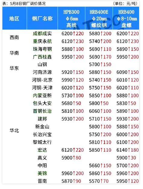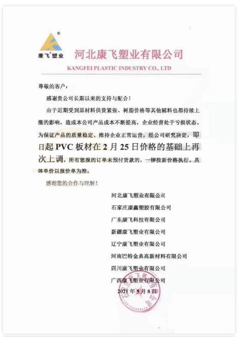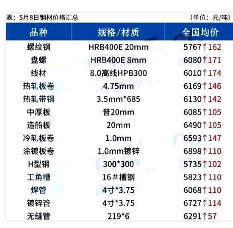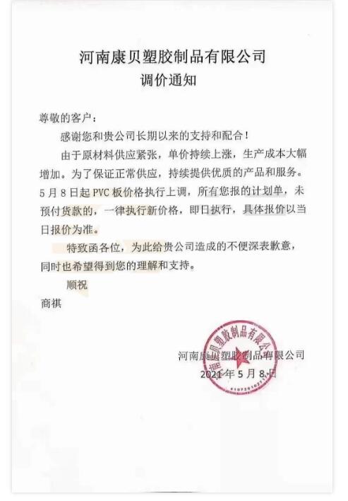 聚酯樹脂原材料新戊二醇五月以來上漲1600元/噸,目前報價19250元/噸,漲幅9.07%,創十二個月新高,部分下游樹脂工廠生產需要,剛需適當采購,新戊二醇工廠訂單延續支撐,短期內出貨壓力可控。 新戊二醇原材料異丁醛日漲1600元/噸,單日漲幅9.17%,5月以來上漲2000元/噸,漲幅11.73%,目前報價已經達到19050元/噸,魯西化工異丁醛報價19100元/噸,且即將沖擊20000元/噸。  由于原材料猛漲,目前多家聚酯樹脂企業暫停報價。   苯乙烯三日上漲8.8% 節后,國內苯乙烯市場漲勢兇猛,目前現貨價格漲至10500元/噸,較節前上漲850元/噸,三日漲幅達8.8%。 PVC市場強勢上漲,下游板材全線拉漲 假期歸來,PVC期貨市場開門紅,價格強勢上漲,帶動現貨走勢方向。5月6、7兩日漲幅約2%,同比上漲超60%,廠家普遍調漲,日漲幅度在100-200元/噸左右,現報價多數漲至9000元/噸。 4月塑料價格迎來暴漲,PVC價格已創下10年新高,節后又開啟漲價模式,這導致國內下游PVC板材企業舉步維艱,紛紛發函宣布價格上調,以前報價一律取消,所有產品一單一價。且表示未預付貨款的,交貨一律按新價格執行。   正丁醇漲勢迅猛,3天漲幅近20% 截止5月8日,國內山東地區正丁醇出廠均價15566元/噸,與5月5日價格相比,均價上調2566元/噸,節后三日漲幅19.71%;與4月1日價格相比,均價上調4566元/噸,漲幅41.52%。 節后補貨拉動,丁二烯氛圍回暖 節后國內丁二烯市場行情因下游補貨有所回暖,截止5月8日,國內丁二烯市場價格6840元/噸,價格環比上漲3.69%,價格同比上漲59.23%。 碳酸鈣企業上漲100元/噸 貴州宏泰鋇業、貴州紅星等企業宣布碳酸鋇產品自即日起國內銷售價格上調100元/噸。 銅價突破近16年記錄 全球銅價持續大漲,LME銅和國際銅期貨價格再創歷史新高的背景下,10日早間滬銅突破77000元大關,一度刷新2006年5月以來新高,突破近16年記錄。今年以來,現貨銅較年初上漲28.05%,同比上漲72.49%,逼近2011年2月15日的最高價74900元/噸。  鋁、鉛等金屬上漲超3000元/噸,續刷逾13年來新高 10日,滬鋁期貨升破20000元/噸,續刷逾13年來新高。 電解銅價格70406.0元/噸,較上期上漲3296.4元/噸,漲4.9%。 鋁錠價格18413.4元/噸,較上期上漲519.6元/噸,漲2.9%。 鉛錠價格15156.0元/噸,較上期上漲318.4元/噸,漲2.1%。 鋅錠價格21762.5元/噸,較上期上漲131.0元/噸,漲0.6%。 長江現貨: 1#銅價:77050元/噸,漲2770元/噸 無氧銅絲(硬):78210元/噸,漲2770元/噸 漆包線價:82250元/噸,漲2770元/噸 A00鋁價:20020元/噸,漲340元/噸 廣東現貨: 1#銅價:76950元/噸,漲2800元/噸 A00鋁價:20050元/噸,漲350元/噸 LME銅價:10413美元/噸,漲297美元/噸 滬銅2106:77260元/噸,漲3110元/噸 滬銅2107:77490元/噸,漲3110元/噸 螺紋鋼單噸超6000元,刷新歷史極值 10日,螺紋鋼單噸超6000元,刷新歷史極值。上周末(5月8-9日),鋼坯一日三次上調價格,日累計漲150元/噸,熱卷日累計漲250元/噸。部分地區鋼材市場存在惜售、限售和封庫現象,華東、華北、東北、西北、西南、華中鋼材普漲50—280元/噸。 國內重點城市25mm三級螺紋鋼平均價格5661元/噸,較前一日上漲106元/噸;當天熱軋卷板價格達6118元/噸,打破了2008年歷史最高點紀錄。共95家鋼廠上調廢鋼采購價,漲價區間10-200元,唐山地區主流鋼廠普方坯出廠報價再次累計上調130元報5350元/噸。  全國19家建筑鋼材生產企業上調出廠價50-230元/噸,熱軋板卷:全國24個主要城市4.75mm熱軋板卷均價6169元/噸,較上個交易日上漲146元/噸;冷軋板卷:全國24個主要城市1.0mm冷卷均價6593元/噸,較上個交易日上漲147元/噸;中厚板:全國24個主要城市20mm普板均價6085元/噸,較上個交易日價格上漲105元/噸。  動力煤、焦煤、鐵礦石等黑色系刷新歷史新高 10日,鐵礦石噸價破1300元,新加坡鐵礦石期貨漲超9%,至224美元/噸的紀錄高位。鐵礦石近期開啟了一波較為強勁的走勢,普氏62%鐵礦石價格指數達到212.8美元/噸,在最近十天內三度刷新歷史最高值。 受動力煤供給仍偏緊影響,動力煤期貨主力合約收盤漲停,報收849.8元/噸;焦煤報收1912元/噸,價格不斷刷新上市以來新高。山東兩港焦炭市場偏強運行,目前港口地區準一級冶金焦主流現匯出庫價格在2700元/噸左右,一級焦價格在2800元/噸,較前一交易日價格上漲50元/噸。 據塑姐不完全統計,4月以來,已有幾十個行業幾百家企業宣布產品價格調漲。部分產品價格自年初開始就持續上漲,已經突破十幾年的高值,并創下歷史新高。一些企業還宣布未到款或未完成的訂單按照新價格,實行一單一價等措施,并表示未來仍有上漲預期,提醒客戶及時備貨。從大宗工業品到食品家居,漲價潮正悄然入侵人們的日常生活。