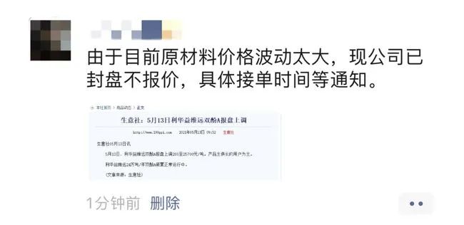 某原材料企業表示,因原料(雙酚A)價格波動太大,企業已封盤不報價。