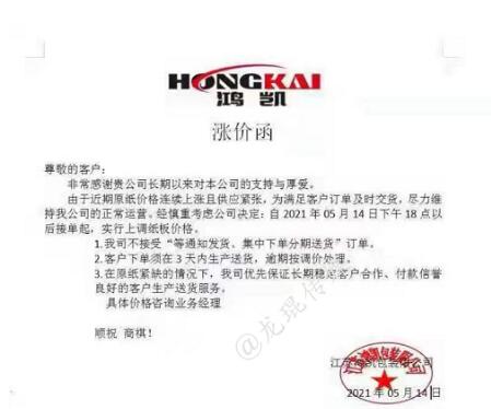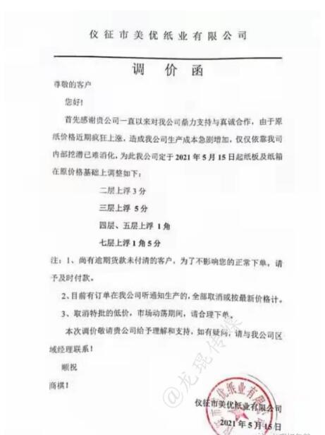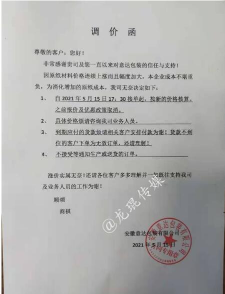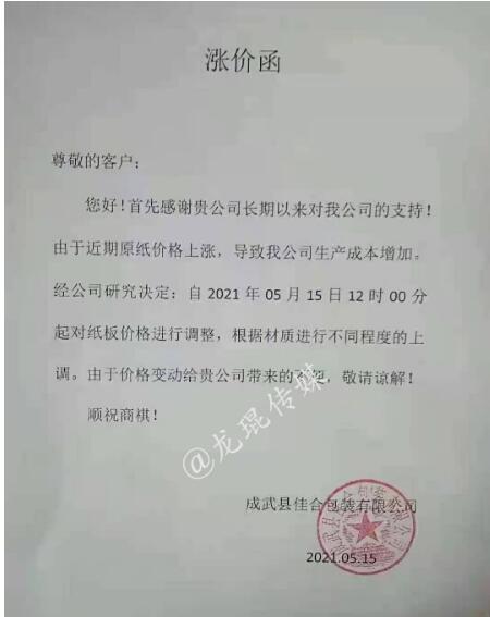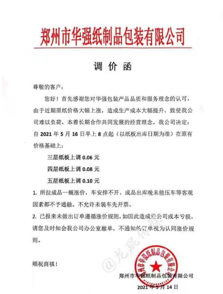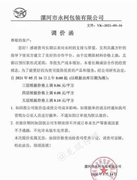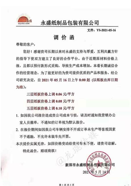 5月14日晚間,玖龍紙業(yè)再度傳出漲價(jià)的消息:自5月17日起,玖海牛上漲100元/噸,地龍牛卡、地龍?jiān)偕⒔堅(jiān)偕?ㄉ蠞q50元/噸。這是玖龍紙業(yè)在本月啟動(dòng)的第三輪上漲,距離第一輪漲價(jià),時(shí)間僅相差不過一周時(shí)間。 實(shí)際上,近期乃至今年以來,不止是原紙價(jià)格,銅、鋁材、鋼鐵、玻璃、塑料等大宗商品價(jià)格均迎來長時(shí)間上調(diào)。其中一個(gè)重要原因便是,美國采取量化寬松的經(jīng)濟(jì)刺激政策,瘋狂加印鈔票。因?yàn)槊涝鞘澜缲泿牛芸炀湍芰魍ㄈ澜纭X泿乓坏┰霭l(fā),物價(jià)必然上漲。 而對(duì)于包裝印刷業(yè)而言,紙價(jià)的上漲,無疑令其成本急劇增加。5月14日-5月16日,伴隨著玖龍?jiān)垵q價(jià)的消息,廣東、河北、重慶、四川、江蘇、安徽等省市紙板市場(chǎng)也迎來了新一輪漲價(jià),其中不少紙板廠已是第二輪上漲。 最新的紙板漲價(jià)函 漯河市永柯包裝有限公司 從2021年5月16日上午8點(diǎn)開始,三層紙板價(jià)格上漲0.06元/平方,四層紙板價(jià)格上漲0.08元/平方,五層紙板價(jià)格上漲0.10元/平方。  永盛紙制品包裝有限公司 從2021年5月16日上午8點(diǎn)開始,三層紙板價(jià)格上漲0.06元/平方,四層紙板價(jià)格上漲0.08元/平方,五層紙板價(jià)格上漲0.10元/平方。  鄭州華強(qiáng)紙制品包裝有限公司 從2021年5月16日上午8點(diǎn)開始,三層紙板價(jià)格上漲0.06元/平方,四層紙板價(jià)格上漲0.08元/平方,五層紙板價(jià)格上漲0.10元/平方。
