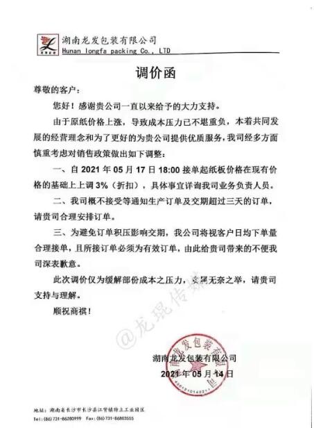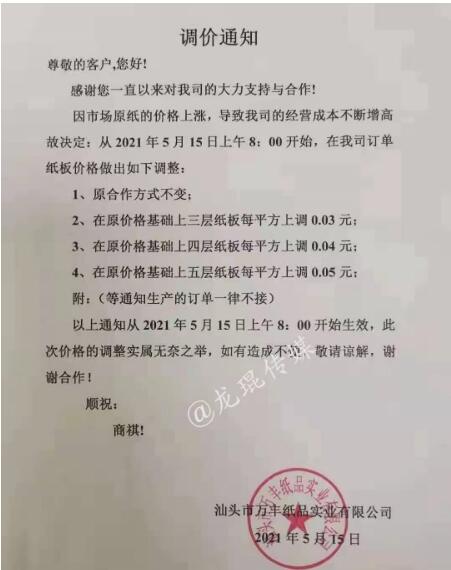 湖南龍發(fā)包裝有限公司 從2021年5月17日上午18點(diǎn)開始,紙板價(jià)格在現(xiàn)有價(jià)格基礎(chǔ)上上漲3%。  汕頭市萬豐紙品實(shí)業(yè)有限公司 從2021年5月15日上午8點(diǎn)開始,三層紙板每平方上漲0.03元/平方,四層紙板每平方上漲0.04元/平方,五層紙板每平方上漲0.05元/平方。