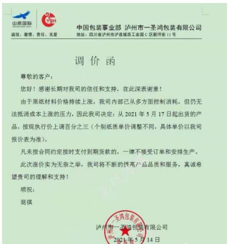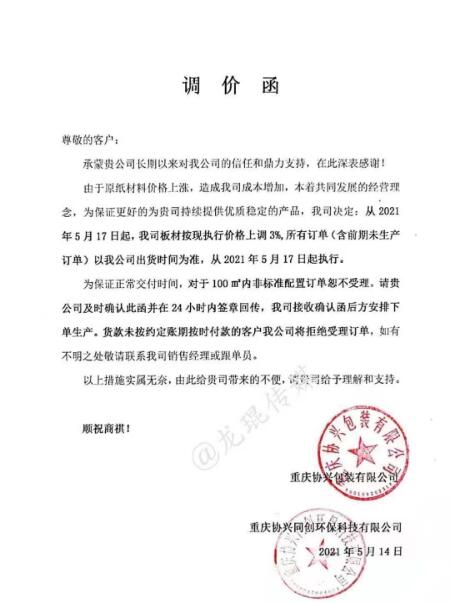 瀘州市一圣鴻包裝有限公司 從2021年5月17日起,按現(xiàn)執(zhí)行價(jià)格上漲3%。  重慶協(xié)興包裝有限公司 從2021年5月17日起,板材現(xiàn)價(jià)格在執(zhí)行價(jià)格基礎(chǔ)上上漲3%。