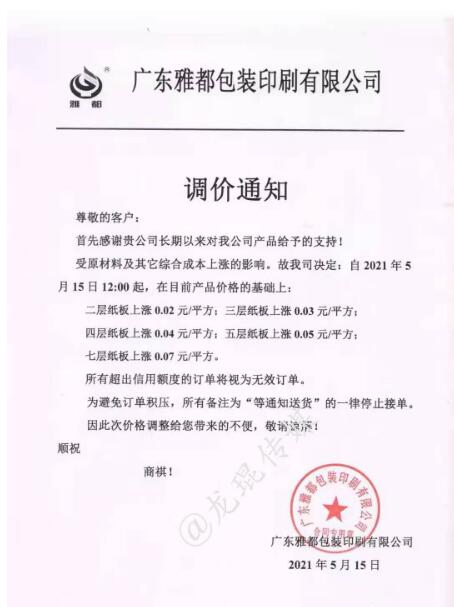 廣東雅都包裝印刷有限公司 從2021年5月15日12點(diǎn)起,二層紙板上漲0.02元/平方,三層紙板上漲0.03元/平方,四層紙板上漲0.04元/平方,五層紙板上漲0.05元/平方,七層紙板上漲0.07元/平方。