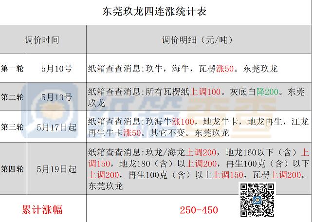 連漲4輪!玖龍用實力證明了市場的瘋狂...... 1、玖龍再漲200元 5月19號,玖龍多基地原紙再次上調200,隨著玖龍的連續4輪漲價,紙板廠深感自己掉隊了,紙板漲價速度遠遠跟不上原紙廠漲價的速度,造紙廠說漲就漲,不留余地,沒等紙板廠反應過來,下游的紙箱廠已經把訂單塞過來,新訂單老價格,紙板廠成為本輪漲價最大的背鍋俠…… 讓我們來重新回顧一下玖龍的漲價過程:  紙箱查查建議:目前市場屬于強拉之勢,紙板廠必要時可以采用緊急停單措施,或者一日多次漲價來避免嚴重損失,紙箱廠可以提前大量備貨,爭取一波漲價紅利。 2、 原紙價格走勢