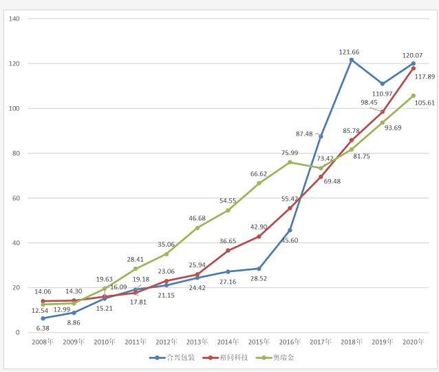 2020年與2008年相比,合興包裝、裕同科技、奧瑞金的營收,分別增長了17.82倍、7.38倍、7.42倍。