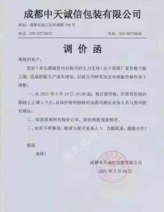 成都中天誠信包裝有限公司 從2021年5月19日10點開始,在原有價格基礎上上漲5個點。