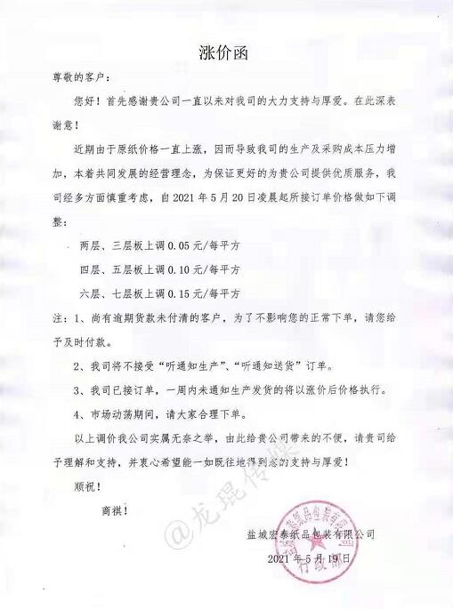鹽城弘泰紙品包裝有限公司 從2021年5月20日凌晨起,兩層、三層上調0.05元/每平方,四層、五層上調0.10元/每平方,六層、七層上調0.15元/每平方。
