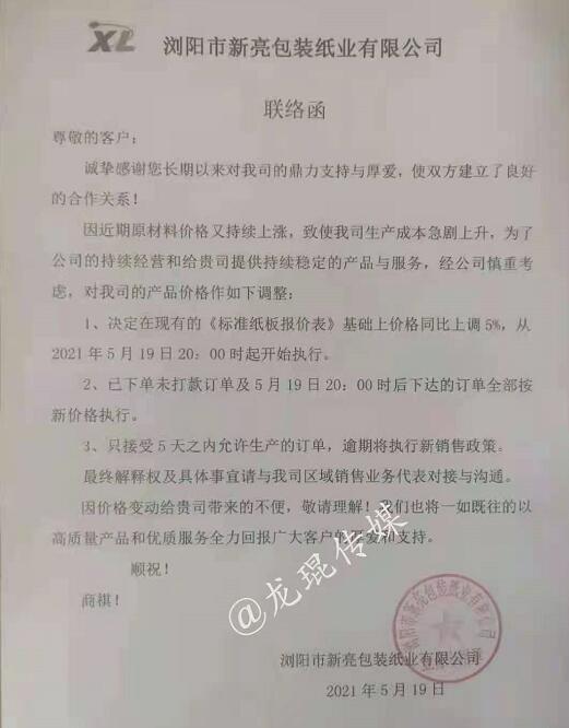 瀏陽市新亮包裝紙業有限公司 從2021年5月19日20點開始,在原基礎上同比上調5%。