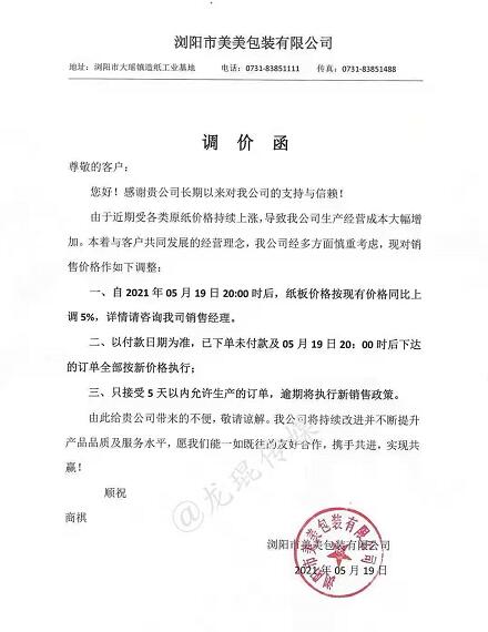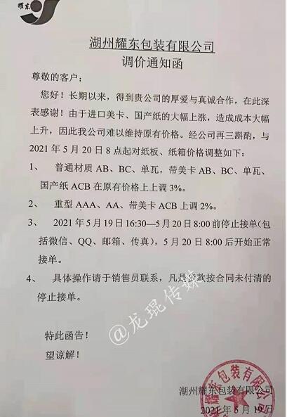 益陽市華發包裝材料有限公司 從2021年5月19日17點半接單起,在客戶原來價格基礎上上漲10%。另,5月19日前下的訂單,在5月22日未提貨的全部上調10%。
