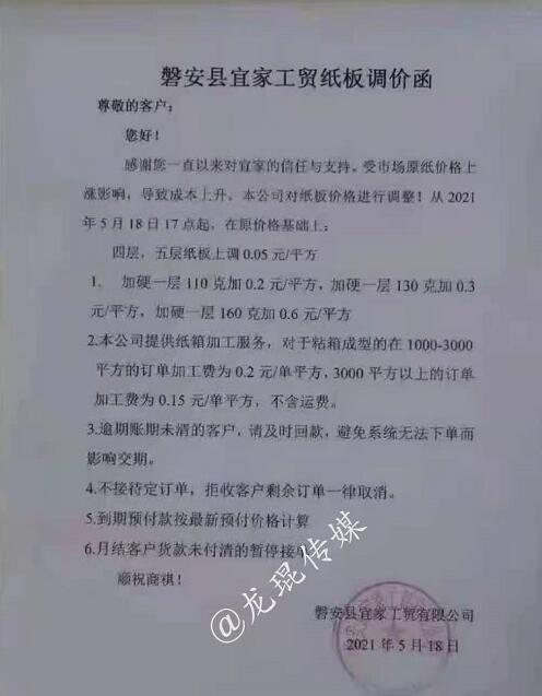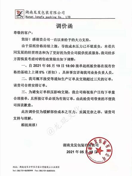 湖南龍發包裝有限公司 從2021年5月19日18點接單起,紙板價格在現有價格基礎上上漲5%(折扣)。