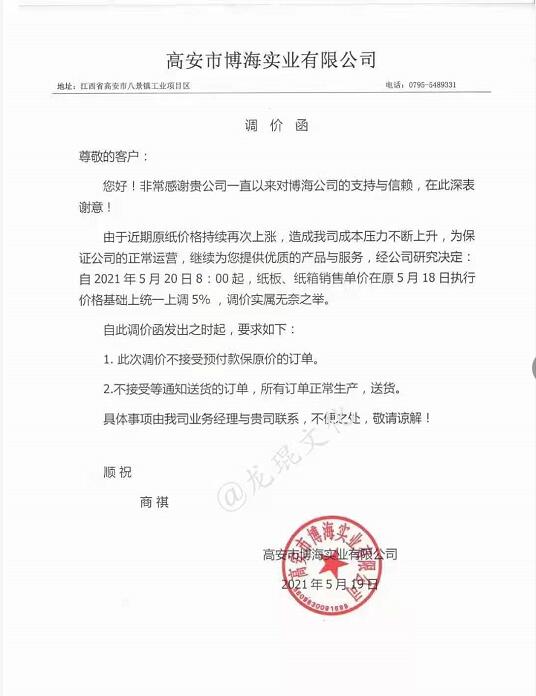高安博海實業有限公司 從2021年5月20日8點開始,紙板紙箱售價在原基礎上上調5%。