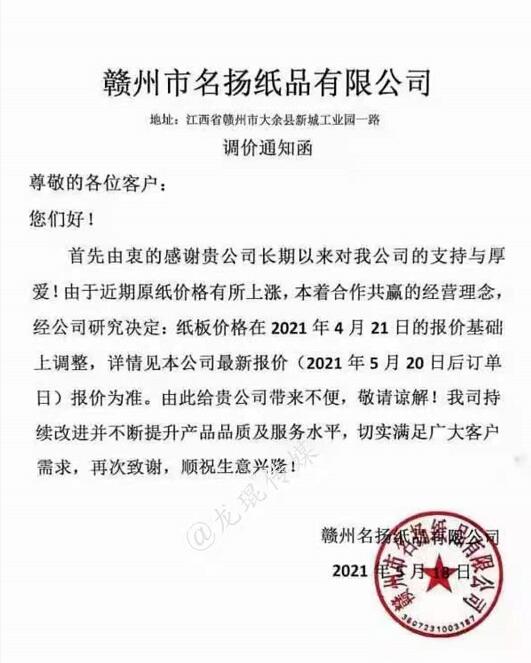 贛州市名揚紙品有限公司 從2021年5月20日起,對紙板價格進行調整。