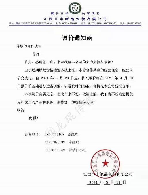 江西巨豐紙品包裝有限公司 從2021年5月20日起,在原報價單基礎上進行適當上調。