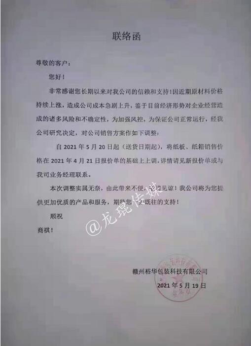 贛州市裕華包裝科技有限公司 從2021年5月20日起,將紙板、紙箱銷售價格在原報價單基礎上上調。