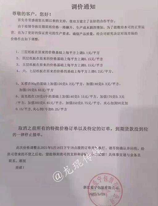 浙江愛寧包裝有限公司 從2021年5月18日起,三層紙板上調0.1元/平方,四層紙板上調0.15元/平方,五層紙板上調0.15元/平方,六、七層紙板上調0.2元/平方。