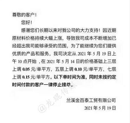 蘭溪金百泰工貿有限公司 從2021年5月19日上午10點開始,三層上漲0.05元/單平方,五層上漲0.10元/單平方,七層上漲0.15元/單平方。