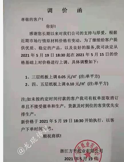 浙江方平紙業有限公司 從2021年5月19日18點半開始,三層紙板上調0.05元/單平方,四、五層紙板上調0.10元/單平方。