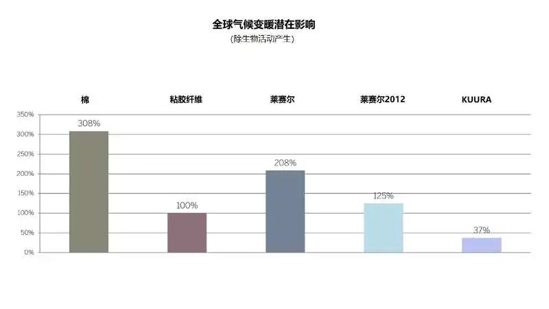 圖1:CARTIF全球氣候變暖潛在影響 CARTIF給予Kuura良好的評估結(jié)果。就環(huán)境績效而言,與其他商用人造纖維素纖維(纖維膠和萊賽爾纖維)和棉花相比,Kuura對氣候變化的影響最小,證明其可作為紡織纖維市場的可持續(xù)方案(見圖1)。更具體地說,與使用現(xiàn)有商業(yè)紡織纖維相比,Kuura紡織纖維運用芬蘭當?shù)乜沙掷m(xù)管理的木材原料,現(xiàn)有工廠提供的完全非化石能源,再輔以創(chuàng)新生產(chǎn)工藝,具有明顯減緩氣候變化的潛力。