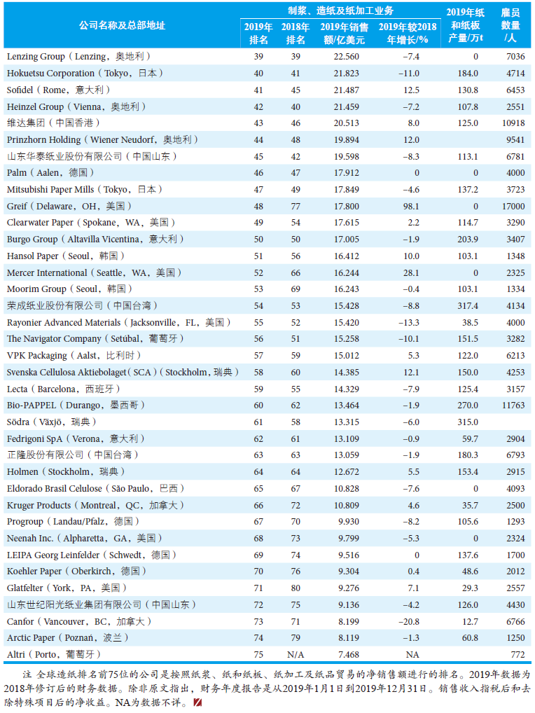 《Paper 360°》2019年全球造紙排名前75位的公司名單